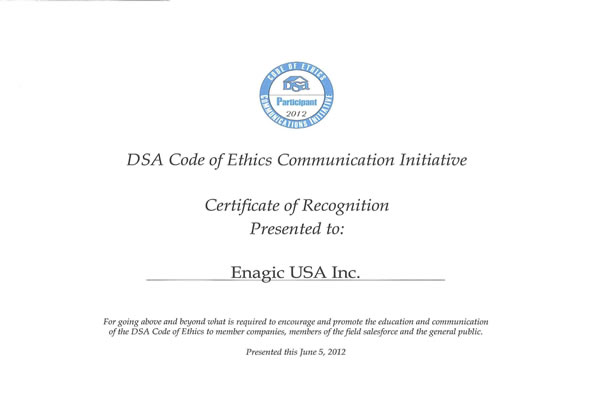 Enagic International está certificada con ISO 9001, ISO 14001 e ISO 13485 para el control de calidad y la gestión ambiental, el Sello de Oro de la Asociación de Calidad del Agua para la certificación de productos y un miembro de buena reputación de la prestigiosa Asociación de Venta Directa.